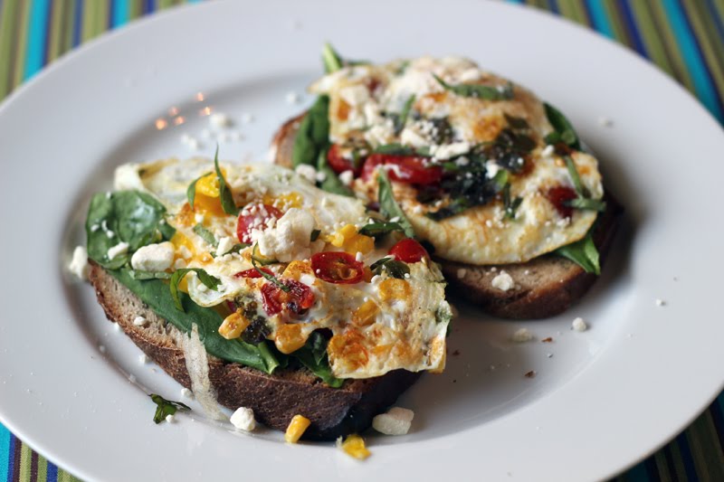 -Place spinach on toasted and buttered bread. Place egg on spinach. Sprinkle with feta and fresh basil. Salt and pepper to taste.